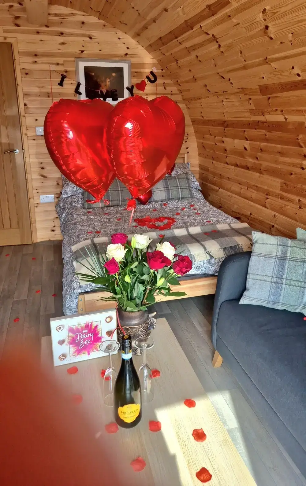 Includes chocolates, bunch of deluxe flowers ,rose petals on bed, I love you banner and heart shaped helium balloons.